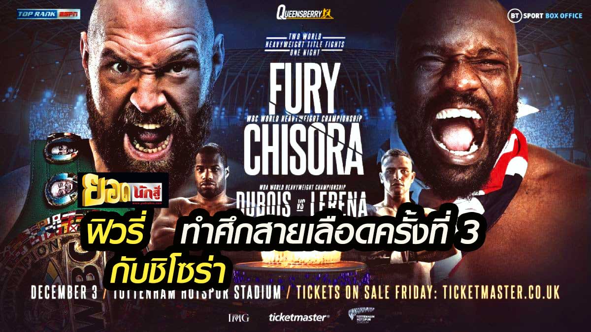 “ยิปซี คิง” ไทสัน ฟิวรี่ จะเปิดศึกสายเลือดอังกฤษกับคู่ปรับเก่า ดีเร็ค ชิโซร่า โดยจะเป็นการชกป้องกันตำแหน่งแชมป์โลกรุ่นเฮฟวี่เวต WBC เป็นครั้งที่ 3 ของฟิวรี่ ในวันเสาร์ที่ 3 ธ.ค.นี้ ที่ ท็อตแน่ม ฮ็อตสเปอร์ สเตเดี้ยม ประเทศอังกฤษ จัดโดย แฟร้งค์ วอร์เรน ร่วมกับ บ๊อบ อารัม สำหรับฟิวร่กับชิโซร่า เคยเจอกันมา 2 ครั้งแล้วในปี 2011 และ 2014 ในศึกชิงแชมป์เครือจักรภพและศึกชิงแชมป์ยุโรปรุ่นเฮฟวี่เวต ฟิวรี่ชนะทั้งสองครั้ง คือชนะคะแนน 12 ยก และชนะอาร์ทีดียก 10 (ชิโซร่าไม่ออกจากมุม)