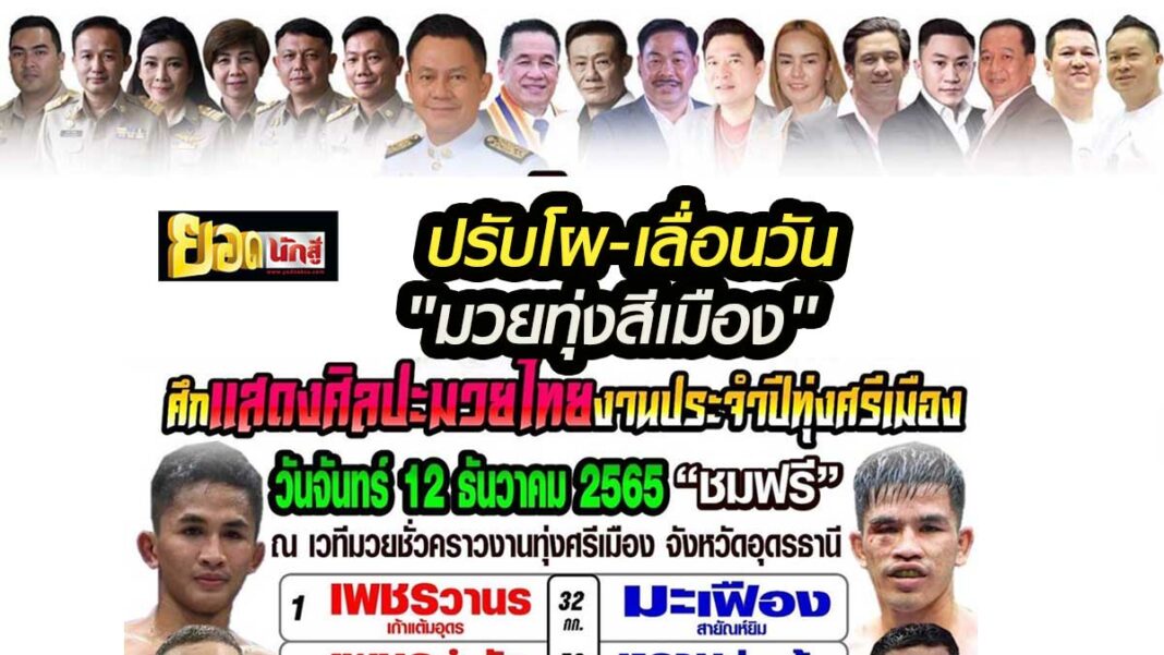 หมาน้อย อุดร” เลขาฯภุชงค์ กิจขยัน ปรับคู่มวยใหม่ศึกแสดงศิลปะมวยไทยงานประจำปีทุ่งศรีเมือง จ.อุดรธานี พร้อมเลื่อนจาก 7 ธ.ค.เป็นจันทร์ที่ 12 ธ.ค.คู่เอกยังเหมือนเดิม “แชมป์ช่อง7” ก้องศึกสวนหลวงรถยก พบ นักรบ แฟร์เท็กซ์ คู่รองสะแกงาม จิตรเมืองนนท์ ชน โชควิทยา โชติบางแสน คู่ค้ำสรรเพช ส.สละชีพ กับ เดือนจิตรเมืองนนท์