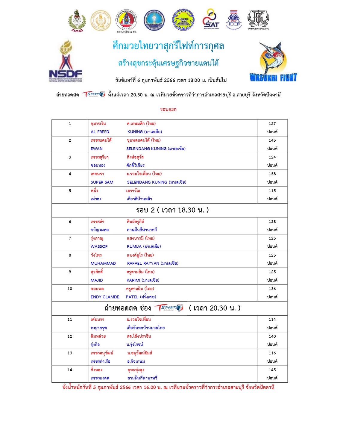 เพชรอนุวัฒน์ น.อนุวัฒน์ยิม พร้อมบู๊เพชรท่าเรือ อ.กิจเกษม หลังจากเคยเสมอกันมาแล้วหนึ่งครั้ง ศึกมวยไทยวาสุกรีไฟต์การกุศลสร้างสุขกระตุ้นเศรษฐกิจชายแดนใต้ วันมวยไทย จันทร์ที่ 6 ก.พ.นี้ที่เวทีมวยชั่วคราวหน้าที่ว่าการอำเภอสายบุรี จ.ปัตตานี T Sport 7 ถ่ายทอดสด 20.30 น.