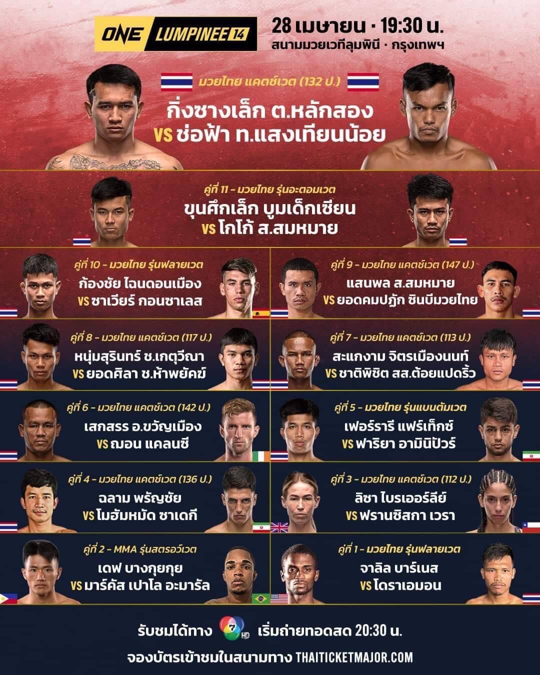 “ONE ลุมพินี” รายการมวยและศิลปะการต่อสู้อันดับหนึ่งของไทย เดินทางมาถึงนัดที่ 14 วันศุกร์ที่ 28 เม.ย.66 ถ่ายทอดสดช่อง 7 เวลา 20.30 – 23.30 น. (โดยแข่งขันคู่แรก 19.30 น.)จากเวทีมวยลุมพินี
