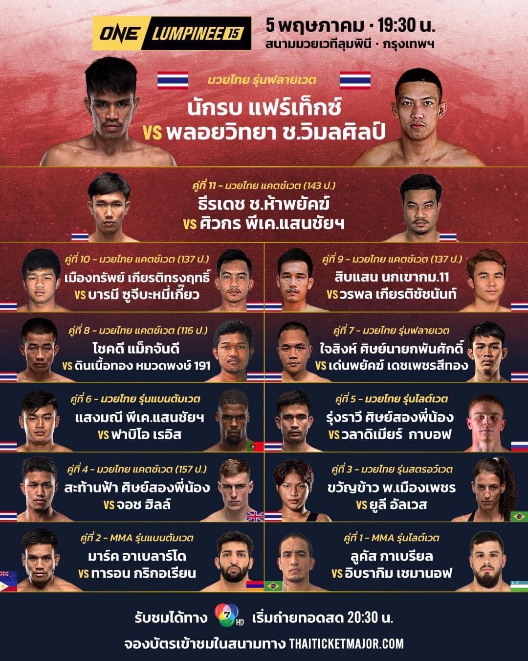 “ONE ลุมพินี” เดินทางมาถึงนัดที่ 15 วันศุกร์ที่ 5 พ.ค 66 ถ่ายทอดสดช่อง 7 เวลา 20.30 – 23.30 น. (โดยแข่งขันคู่แรก 19.30 น.)จากเวทีมวยลุมพินี