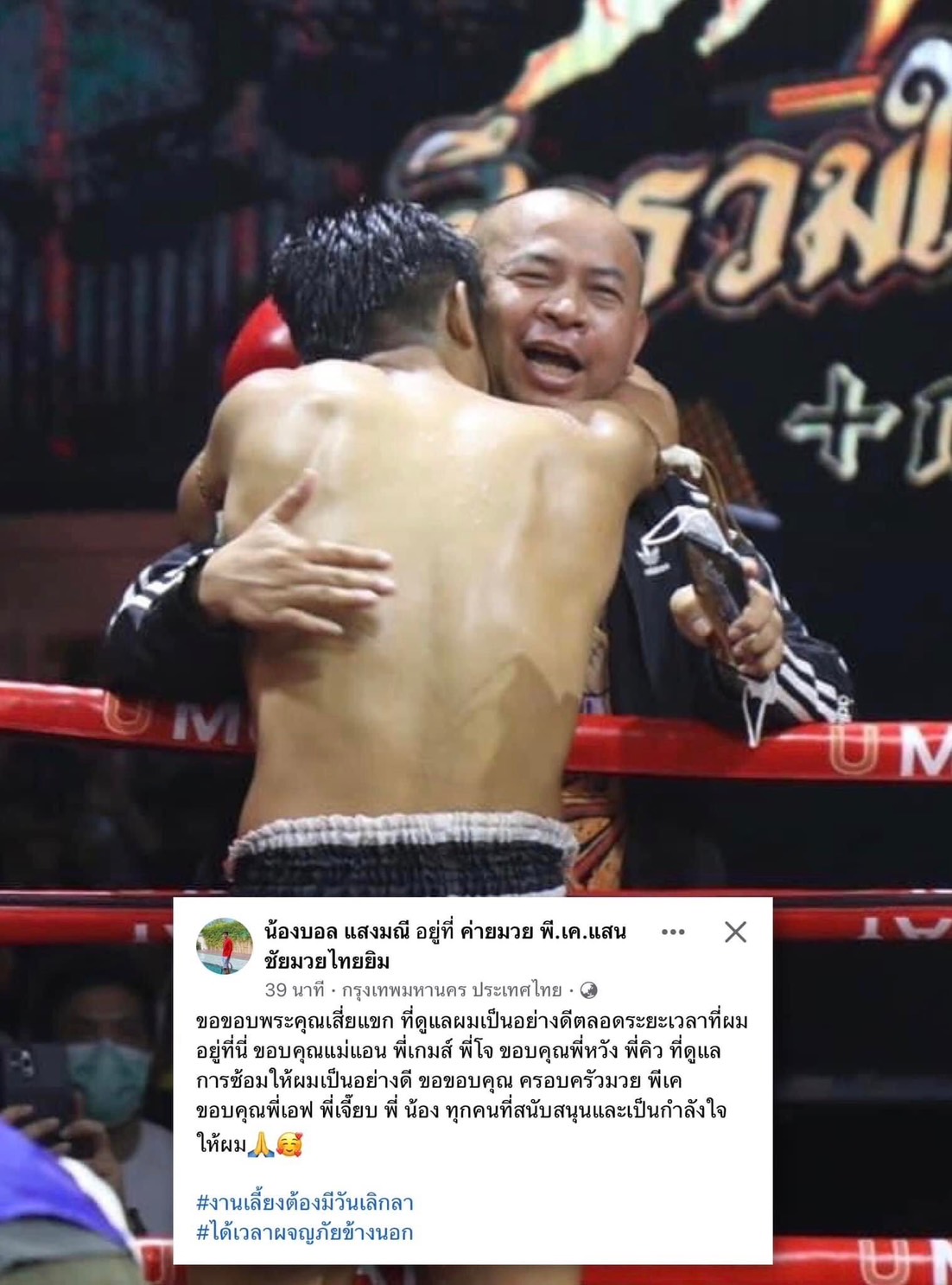 “ขอขอบพระคุณเสี่ยแขก ที่ดูแลผมเป็นอย่างดีตลอดระยะเวลาที่ผมอยู่ที่นี่ ขอบคุณแม่แอน พี่เกมส์ พี่โจ ขอบคุณพี่หวัง พี่คิว ที่ดูแลการซ้อมให้ผมเป็นอย่างดี ขอขอบคุณ ครอบครัวมวย พีเค ขอบคุณพี่เอฟ พี่เจี๊ยบ พี่ น้อง ทุกคนที่สนับสนุนและเป็นกำลังใจให้ผม”🙏🥰