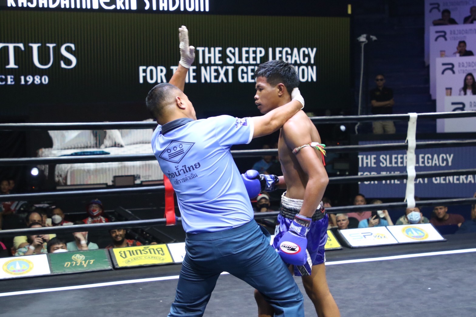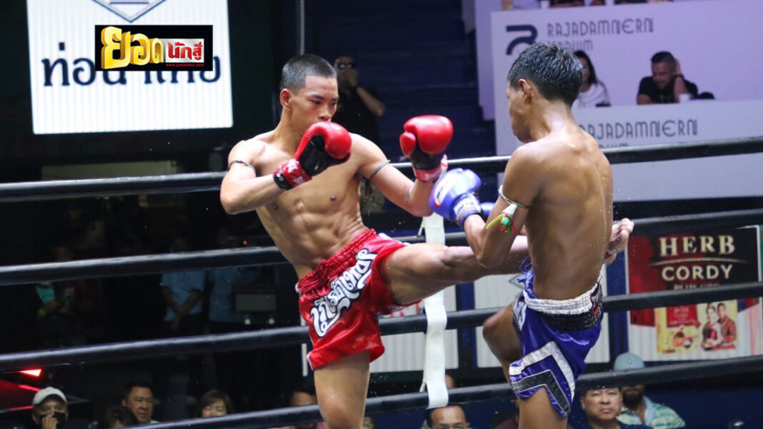เพชรสยาม จ.ภัทรียากีฬาสยาม เคยแพ้น็อก สุดหล่อ สจ.โต้งปราจีน เมื่อ 2 ปีที่แล้วแต่หนนี้เตรียมมาดี ดักเตะซ้ายแทงเข่าฟันศอกจนสุดหล่อแตกอันตราย กรรมการยุติการชกในยกที่ 4