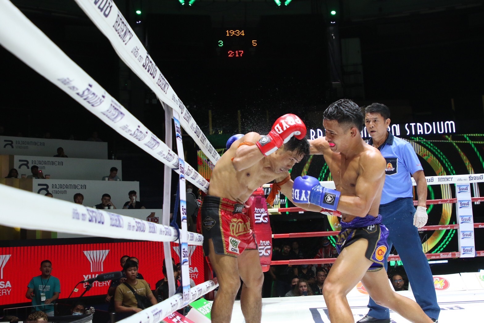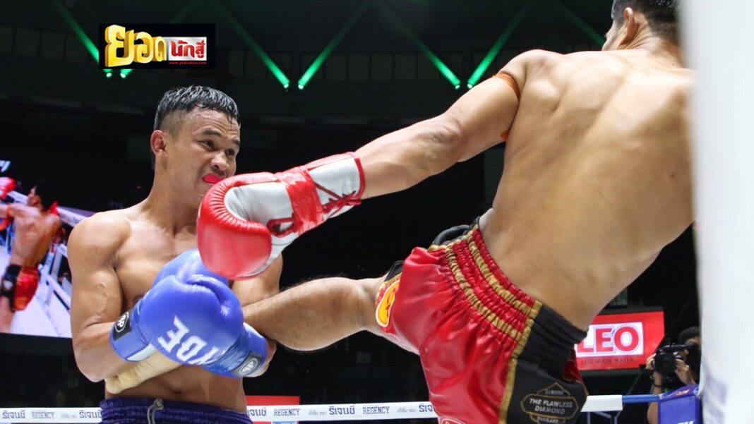 เมืองลาว เกียรติธงยศ นักชก สปป.ลาวเคยแพ้มาแล้วหนึ่งครั้งนัดนี้เดินหน้าลุยออกแข้งปล้ำตีเข่าแต่ก็โดนสท้านฟ้า ทรงเดชรถบ้าน นักชกวัยเก๋าเล่นจังหวะฝีมือไม่ปะทะหมุนเหลี่ยมเข้าสู้ แฟนมวยมองว่าสะท้านฟ้ากินเหลี่ยมกินทรงน่าชนะแต่กรรมการให้เมืองลาวเป็นฝ่ายชนะคะแนนไปแก้มือสำเร็จ ศึกเพชรยินดี วันพฤหัสบดีที่ 15 มิถุนายน 2566 เวทีราชดำเนิน
