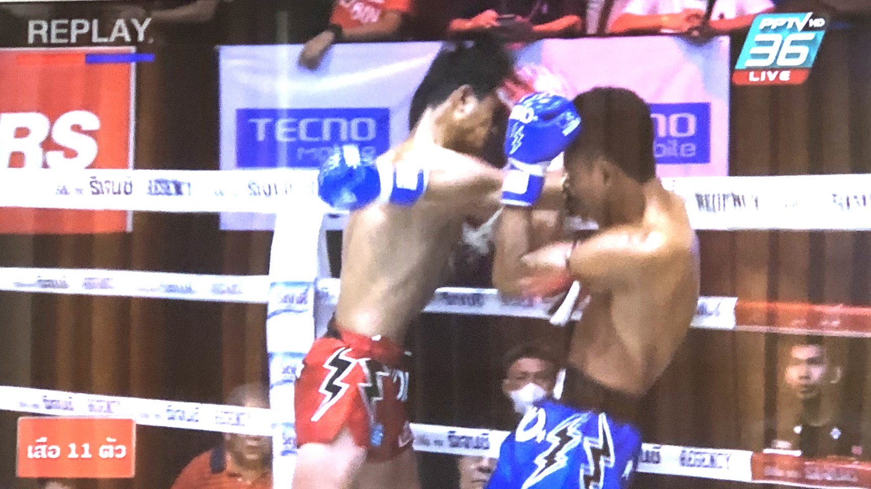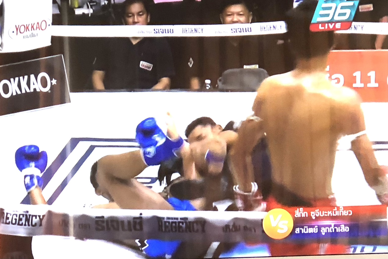 สี่กั๊ก ซูจีบะหมี่เกี๊ยว โชว์กระโดดเขาลอยใส่ สานิตย์ ลูกถ้ำเสือมวยไทย ร่วงลงไปกองกับพื้น จากนั้นชกต่อ สี่กั๊กลุยแหลกฟันศอกจนคู่ชกร่วง สี่กั๊กชนะน็อกเพียงแค่ยกแรก ศึกมวยดีวิถีไทย วันอาทิตย์ที่ 27 สิงหาคม 2566 เวทีมวยจิตรเมืองนนท์ หยกขาว บ็อกซิ่ง สเตเดี้ยม