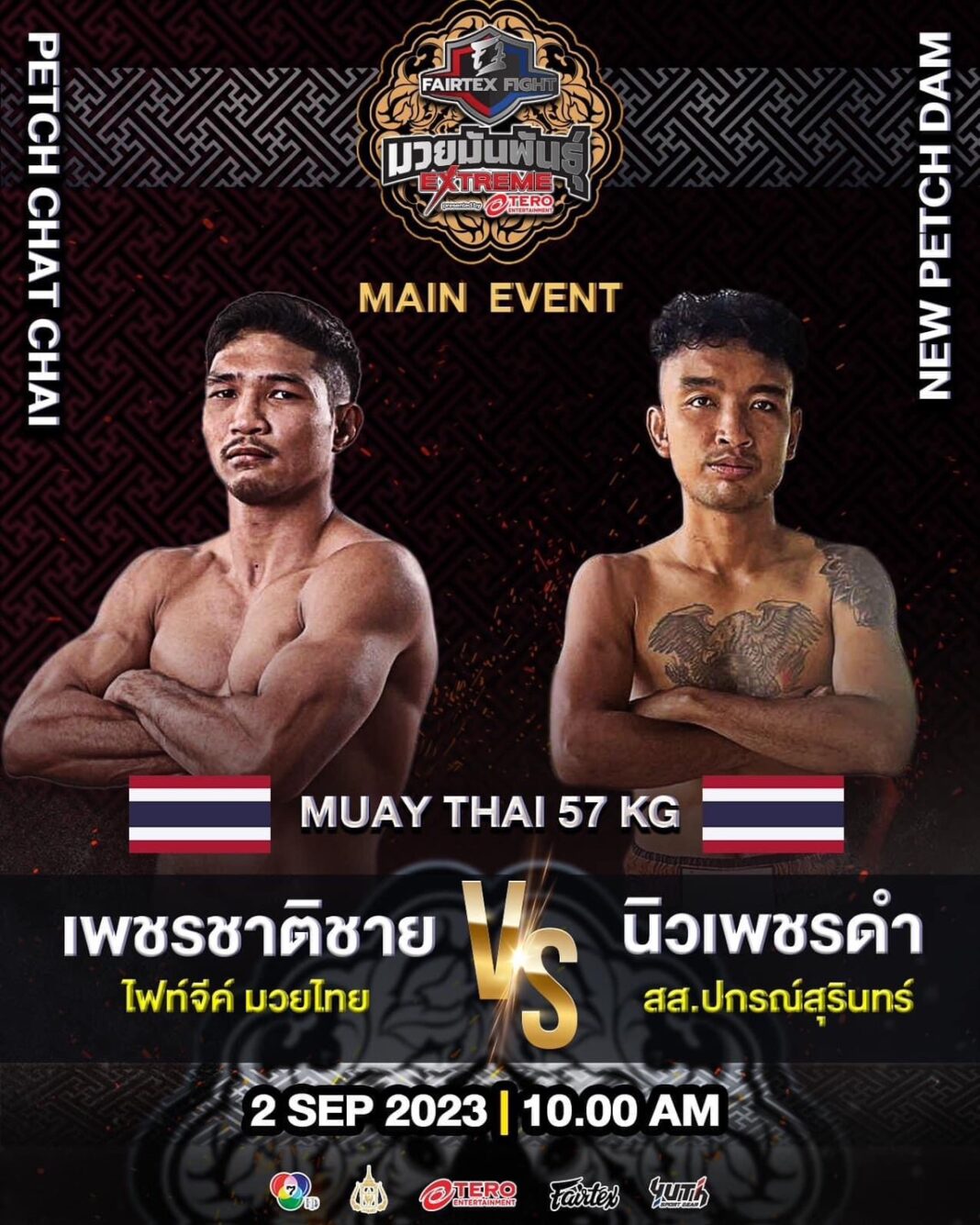 “ทายาทมนุษย์หิน”เพชรชาติชาย ชาวไร่อ้อย ในสีเสื้อ ไฟท์จีค์มวยไทย พร้อมบวก นิวเพชรดำ สส.ปกรณ์สุรินทร์ คู่เอกศึกแฟร์เท็กซ์ไฟต์มวยมันพันธุ์เอ็กซ์ตรีม เสาร์ที่ 2 ก.ย.2566 เวทีลุมพินี ช่อง7 ถ่ายทอดสด 10.00-12.00 น.
