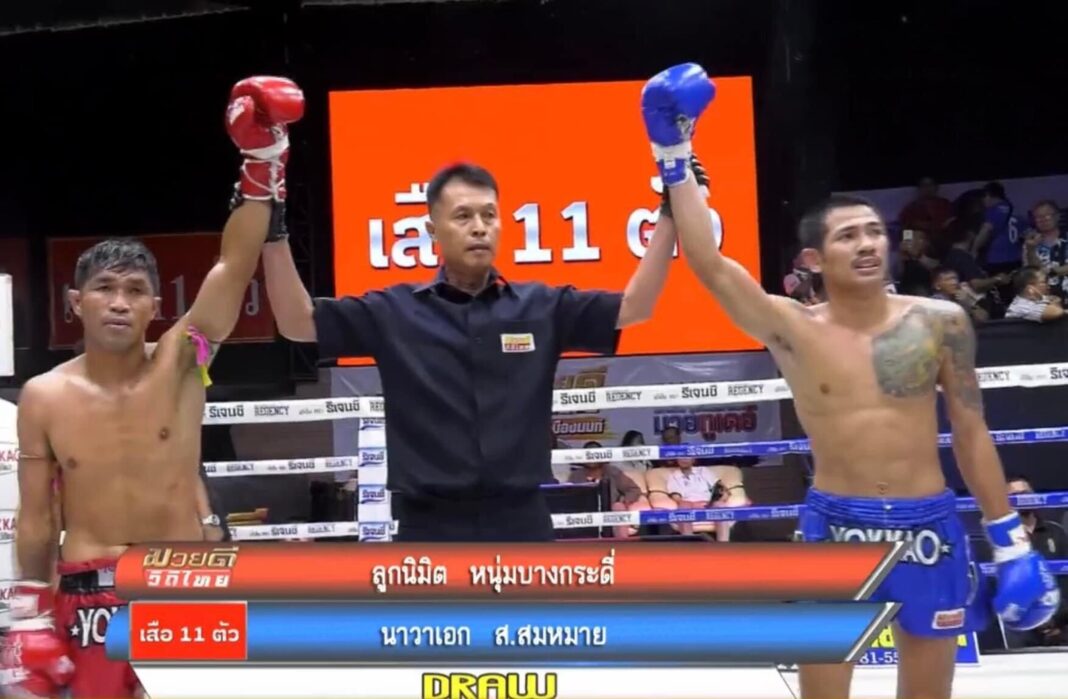 ลูกนิมิต หนุ่มบางกระดี่ มวยรุ่นเดอะ เดินลุยสาดแข้งปล้ำตีเข่าแต่ก็โดนนาวาเอก ศิษย์เชฟบุญธรรม ดักเตะ ดักแทง เนื้อๆ เน้นๆ ลูกนิมิตเดินแต่ทำไม่ชัดอาศัยเชียร์ดัง ครบยกกรรมการให้เสมอกันไป ศึกมวยดีวิถีไทย วันอาทิตย์ที่ 3 กันยายน 2566 เวทีมวยจิตรเมืองนนท์ หยกขาว บ็อกซิ่ง สเตเดี้ยม