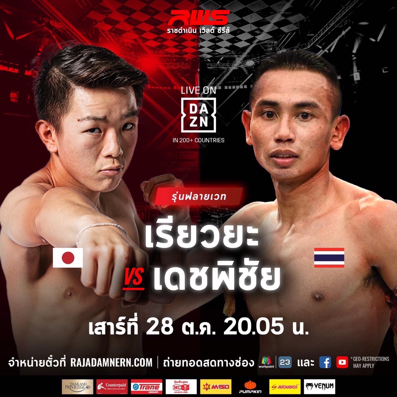 แชมป์จริง ปะทะ แชมป์เฉพาะกาล ได้เวลาพิสูจน์ฝีมือกันเสียที รูปแบบ 3 ยก ในศึก RWS วันเสาร์ที่ 28 ต.ค.นี้ ระหว่าง เรียวยะ เอวะสปอร์ตยิม กับ เดชพิชัย นาวีอันดามัน ซึ่งต่างฝ่ายต่างเป็นแชมป์ประเทศไทยในรุ่นฟลายเวท โดย เรียวยะ เป็นแชมป์จริง ส่วน เดชพิชัย เป็นแชมป์เฉพาะกาล การชกนัดนี้ จึงถือว่าเป็นการหานักชกอันดับ 1 ในรุ่นฟลายเวตของประเทศไทย คอมวยห้ามพลาด