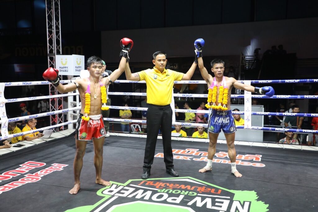 แอ๊ดเทวดา ต.สุรัตน์ จากเพชรยินดี ข้ามศึกดวล เพชรนาย่า โหน่งบางทราย แชมป์ประเทศไทย 115 ป.สู้กันสนุก แอ๊ดเทวดา ได้เหลี่ยมหักสวยๆ หมด 4 ยกต่อ 10-1 แต่ยกสุดท้ายเพชรนาย่าลุยแหลกปล้ำตีอุตลุด สุดท้ายกรรมการให้เสมอกันไปชนิด 3 หนุ่ม 3 มุม ศึกมวยไทยพันธมิตร วันจันทร์ที่ 6พฤศจิกายน 2566 เวทีมวยกองทัพอากาศ