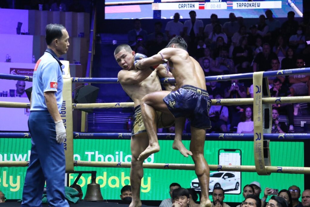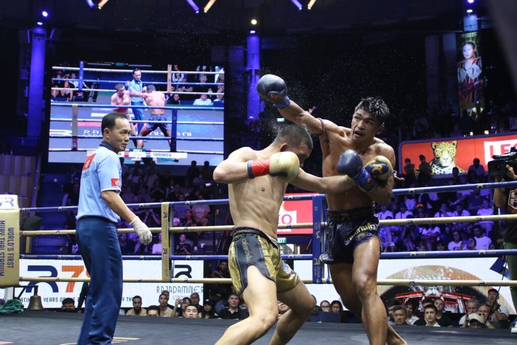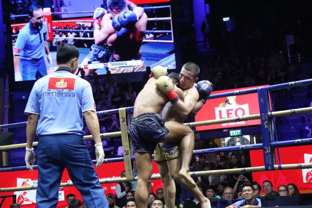 ตะเภาแก้ว สิงห์มาวิน รุ่นน้องตัวใหญ่ใจถึงเดินลุยใส่ กัปปิตัน เพชรยินดีอคาดามี่ ทั้งแข้ง หมัด ปล้ำฟัดขย่มเข่าอย่างเมามันส์ เกินกว่าที่รุ่นพี่จะต้านไหว ตะเภาแก้วชนะคะแนนขาดลอย ศึกวันสถาปนาสนามมวยราชดำเนินครบรอบ 78 ปี วันพุธที่ 27 ธันวาคม 2566