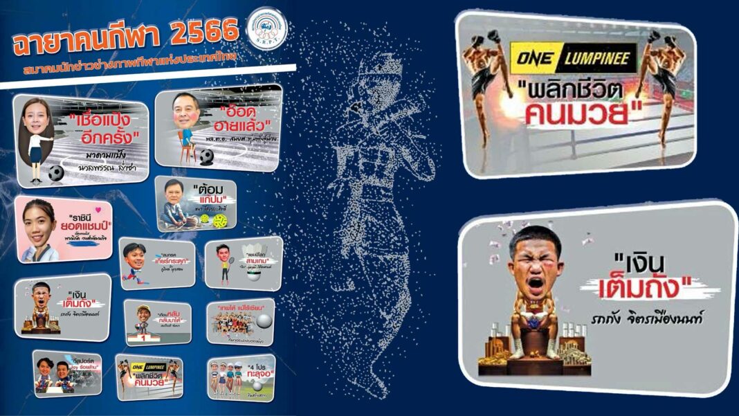 สวัสดีปีใหม่ 2567ครับแฟนๆกีฬาทั่วประเทศ ถือเป็นกิจกรรมประจำช่วงส่งท้ายปีเก่า ต้อนรับปีใหม่ของ”สมาคมนักข่าวช่างภาพกีฬาแห่งประเทศไทย” ที่ได้ตั้ง”ฉายาคนกีฬา” เป็นประจำทุกๆปี สำหรับปี 2566 ที่ผ่านไป สมาคมฯก็ได้คัดเลือกบุคคลกีฬาที่มีจุดเด่นด้านผลงาน จะเด่นหรือไม่เด่นก็แล้วแต่คิด หรือวลีเด็ดๆของคนกีฬา ที่วงการกีฬาชาวไทยจดจำ ชนิดได้ยินฉายาแล้วนึกหน้าออก