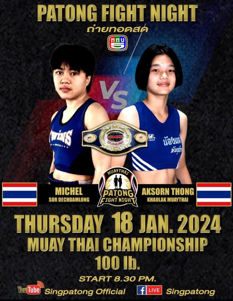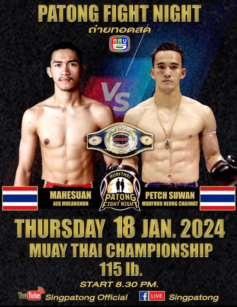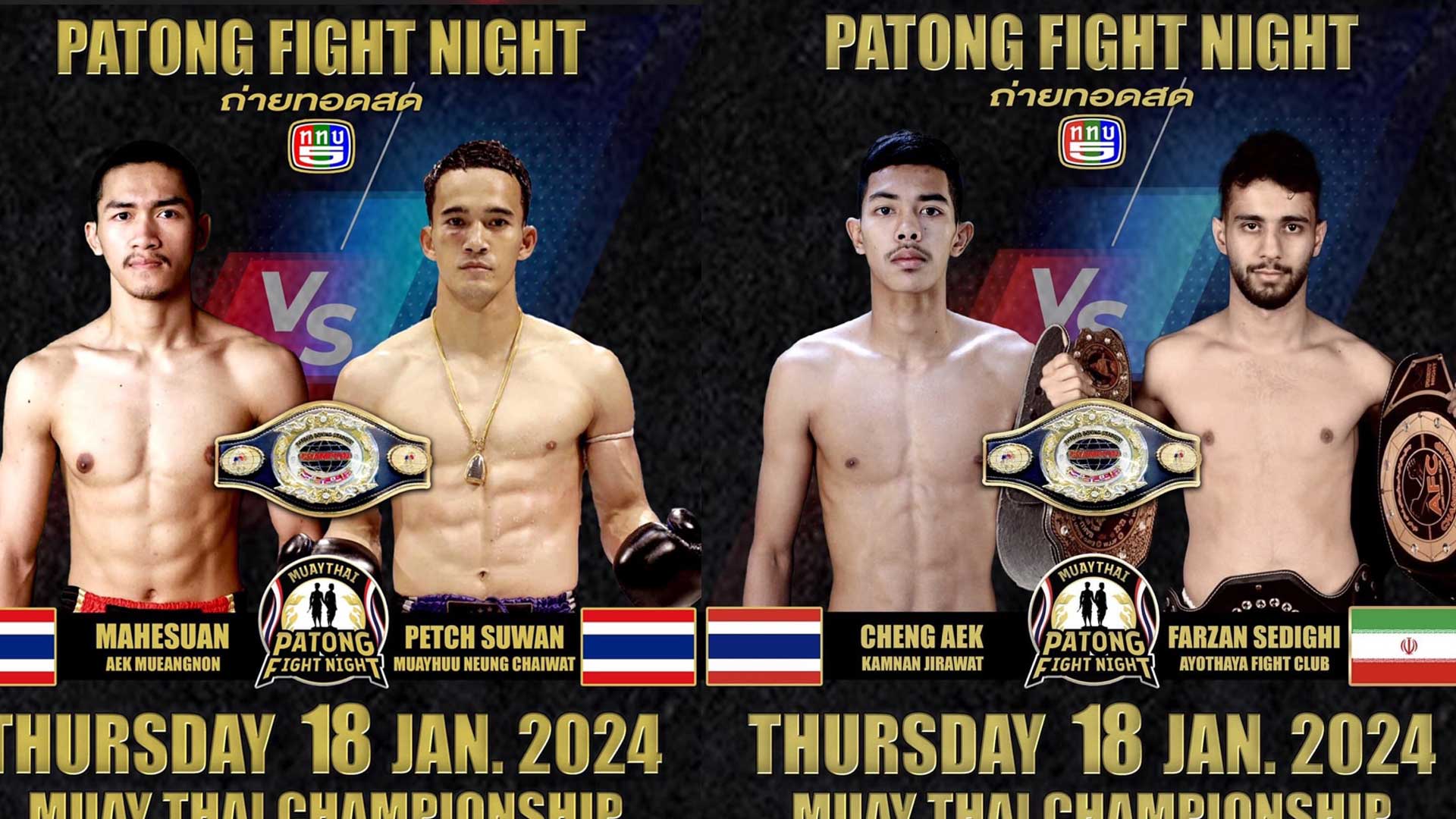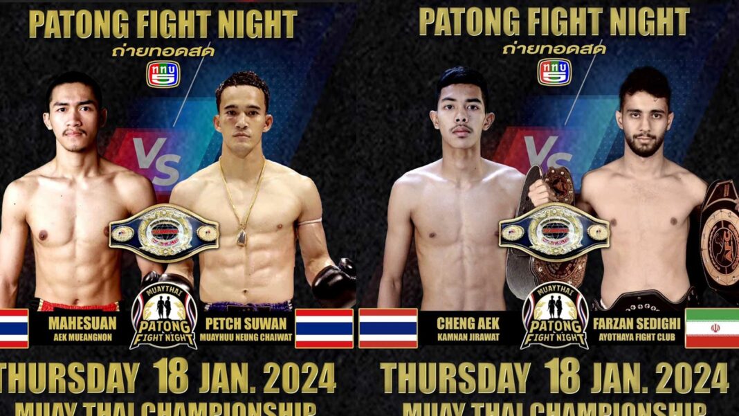 ศึกป่าตองไฟท์ไนท์ ส่งเสริมการท่องเที่ยวไทย จ.ภูเก็ต ถ่ายทอดทางทีวี ททบ. 5 พฤหัสบดีที่ 18 ม.ค.2567 เวทีป่าตองบ๊อกซิ่งสเตเดี้ยม จัดโดยหนุ่มน้อย เมืองหาดใหญ่