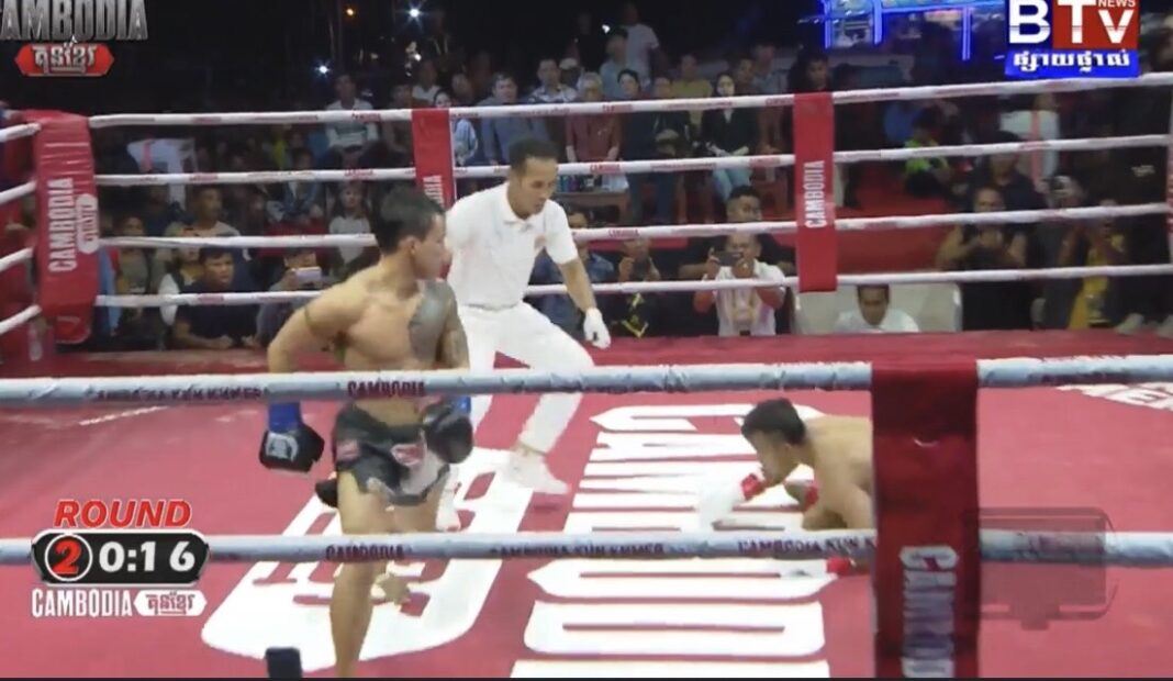 กาก้า แป๊ะมีนบุรี หรือ ซ็อกที กาก้า พลาดท่าโดน ขุนศึกน้อย ศิษย์แก้วประพล หวดแข้งซ้ายเข้าก้านคอถึงทรุดฮวบให้กรรมการนับปลายยก 2 ครบสามยกขุนศึกน้อยบุกชนะคะแนนนักชกขวัญใจชาวขแมร์เจ้าถิ่น ในศึก CAMBODIA KUN KHMER KKIF ที่เมืองเสียบเรียบ ประเทศกัมพูชา เมื่อกลางดึกวันเสาร์ที่ 20 ม.ค.67 ที่ผ่านมา