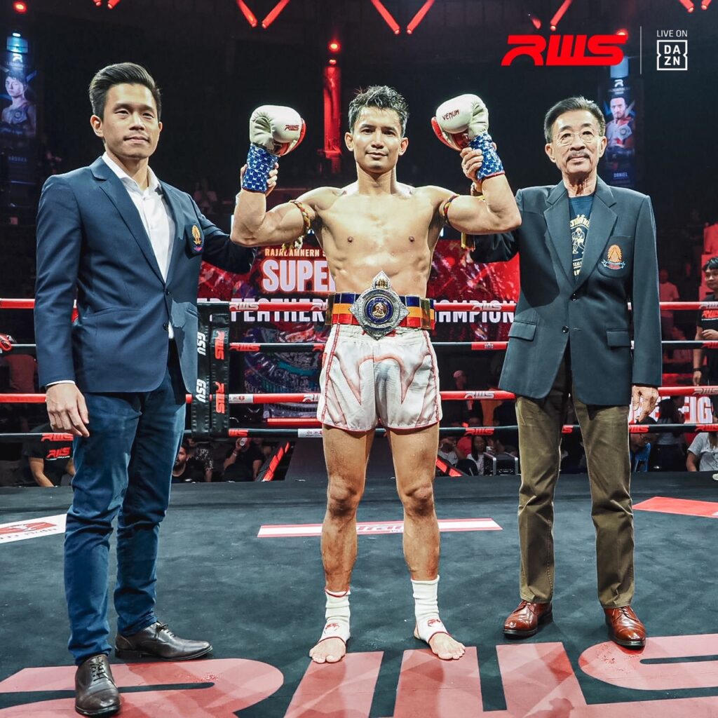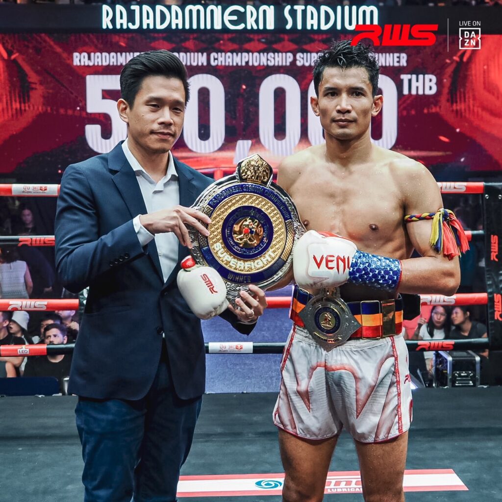 คมปฏัก อ. อัจฉริยะ ขึ้นป้องกันแชมป์รุ่นซูเปอร์เฟเธอร์เวท (130 ปอนด์) เวทีราชดำเนินกับ ฉลาม พรัญชัย ยกแรกผู้ท้าชิงทำคะแนนออกนำไปก่อนแต่ยกที่2 คมปฏัก ได้จังหวะตวัดแข้งซ้ายเข้าเต็มขมับส่งร่าง ฉลาม ร่วงฟังกรรมการนับ8 เกม 3 ยกที่เหลือเป็นฝ่าย ฉลาม ที่เดินหวดแข้งออกอาวุธโต้ตอบได้ดีกว่าเก็บคะแนน ได้ทั้งหมดครบยก ฉลาม เอาชนะคะแนนแย่งแชมป์เวทีราชดำเนินรุ่น130ปอนด์ไปครองได้สำเร็จคู่เอก“ศึกRWS RAJADAMNERN STADIUM CHAMPIONSHIP SUPERFIGHT”