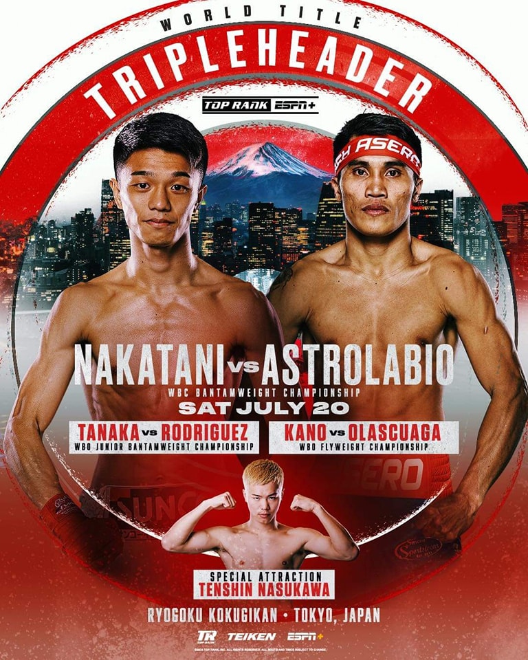 ไทเก้น โปรโมชั่นส์ จากการนำของเจ้านายใหญ่ อากิฮิโกะ ฮอนดะ จะจัดศึกให้นักชกญี่ปุ่นขึ้นชกชิงแชมป์โลกและป้องกันแชมป์โลก รวม 3 คู่ นำโดย จุนโตะ นากาทานิ (27-0-0, 20) ชกป้องกันตำแหน่งแชมป์โลกไฟต์บังคับรุ่นแบนตั้มเวต WBC ครั้งที่ 3 กับนักชกฟิลิปปินส์ วินเซนต์ แอสโตรลาบิโอ (19-4-0, 14) รองแชมป์โลกอันดับ 1