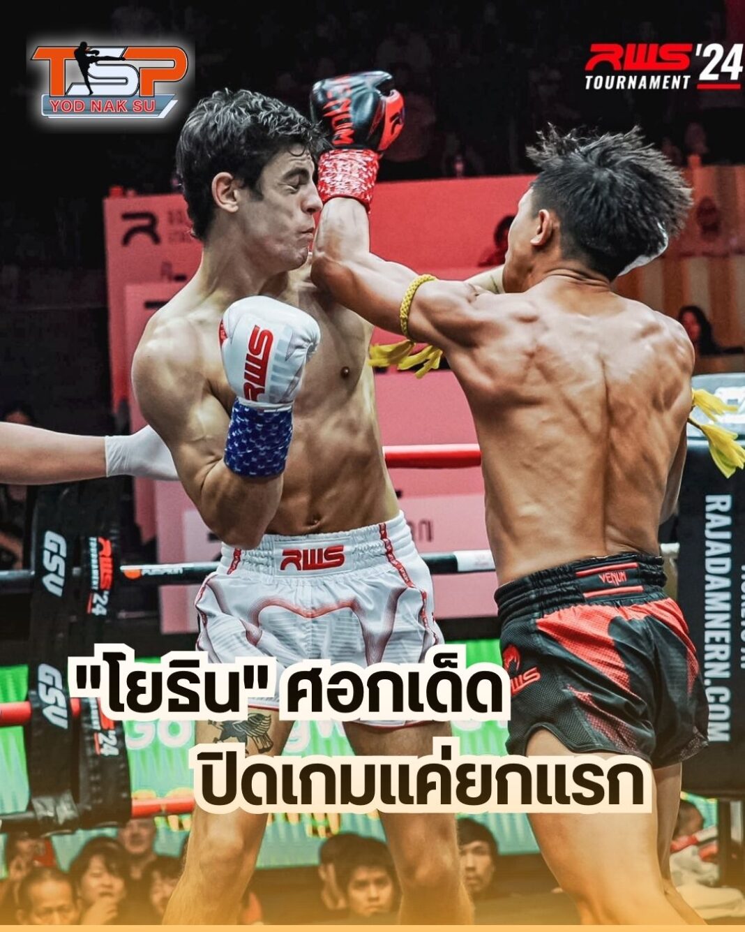 โยธิน เอฟ.เอ.กรุ๊ป ศอกพิฆาตงัดเข้าเต็มคาง แอนเดรส อุนซุย นักชกสเปนจบเพียงแค่ยกแรก ส่วนรณชัย ต.รามอินทรา เตะสอนเชิงชนะคะแนน ฮวน กอร์ดอน นักชกอิสราเอล ศึก RWS Tournament 126 ปอนด์ เมื่อวันเสาร์ที่ 13 ก.ค.2567 เวทีราชดำเนิน