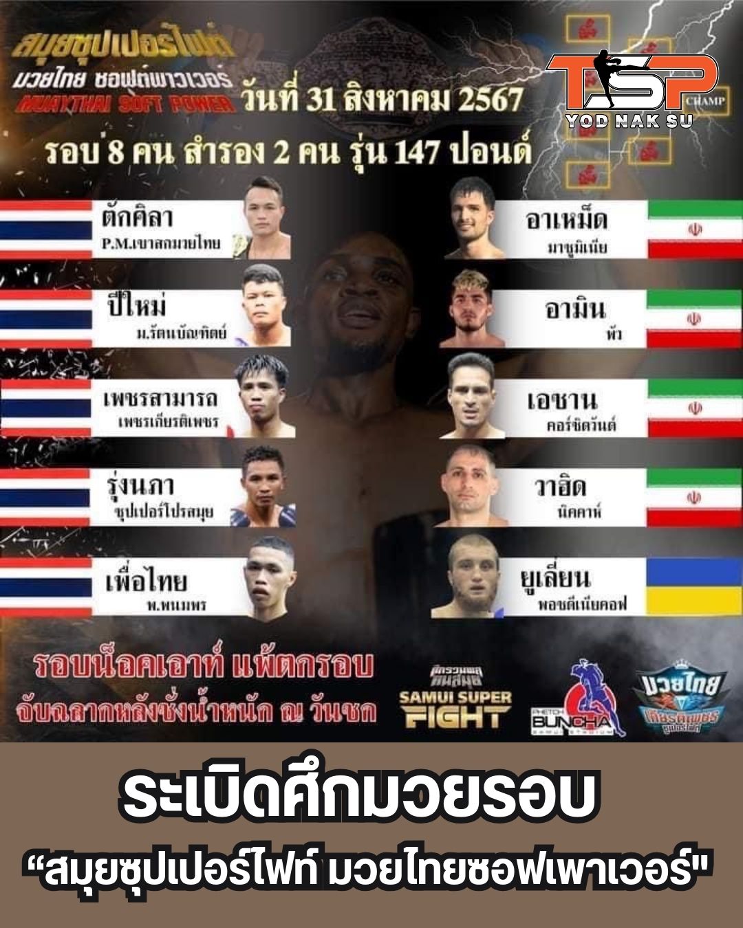 สำหรับนักมวยที่ผ่านเข้ารอบมาประกอบไปด้วย ตักศิลา P.M.เขาสกมวยไทย (ไทย),ปีใหม่ ม.รัตนบัณฑิตย์(ไทย),เพชรสามารถ เพชรเกียรติเพชร(ไทย),รุ่งนภา ซุปเปอร์โปรสมุย(ไทย),เพื่อไทย พ.พนมพร(ไทย),อาเหม็ด มาซูมิเนีย (อิหร่าน),อามิน พัว (อิหร่าน),เอซาน คอร์ขิตวันต์ (อิหร่าน),วาฮิด นิคคาห์(อิหร่าน),ยูเลียน พอชดีเนียคอฟ(ยูเครน) โดยจะทำการชั่งน้ำหนักและจับสลากประกบคู่ ในช่วงเช้าวันที่ 31 ส.ค.67 และทำการแข่งขันสมุยซุปเปอร์ไฟท์ มวยไทยซอฟเพาเวอร์ ในเวลา 21.00น. ถ่ายทอดสดทาง ทาง Facebook และ YouTube