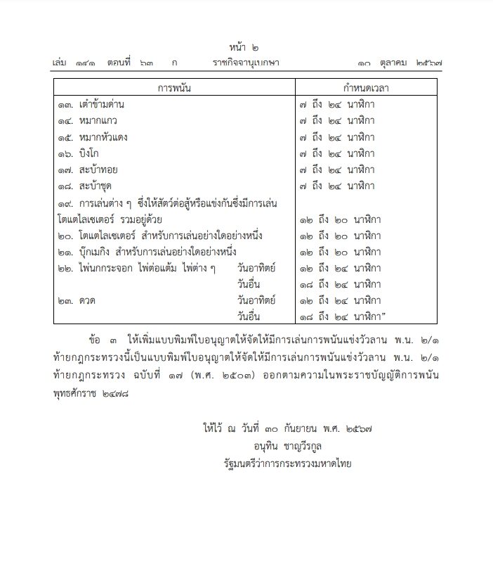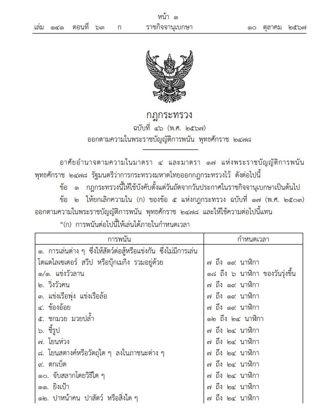 เมื่อวันที่ 10 ตุลาคม 2567 เว็บไซต์ ราชกิจจานุเบกษา เผยแพร่ กฎกระทรวง ฉบับที่ 46 (พ.ศ. 2567) ออกตามความในพระราชบัญญัติการพนัน พุทธศักราช 2478 ให้การพนันต่อไปนี้เล่นได้ภายในกำหนดเวลา